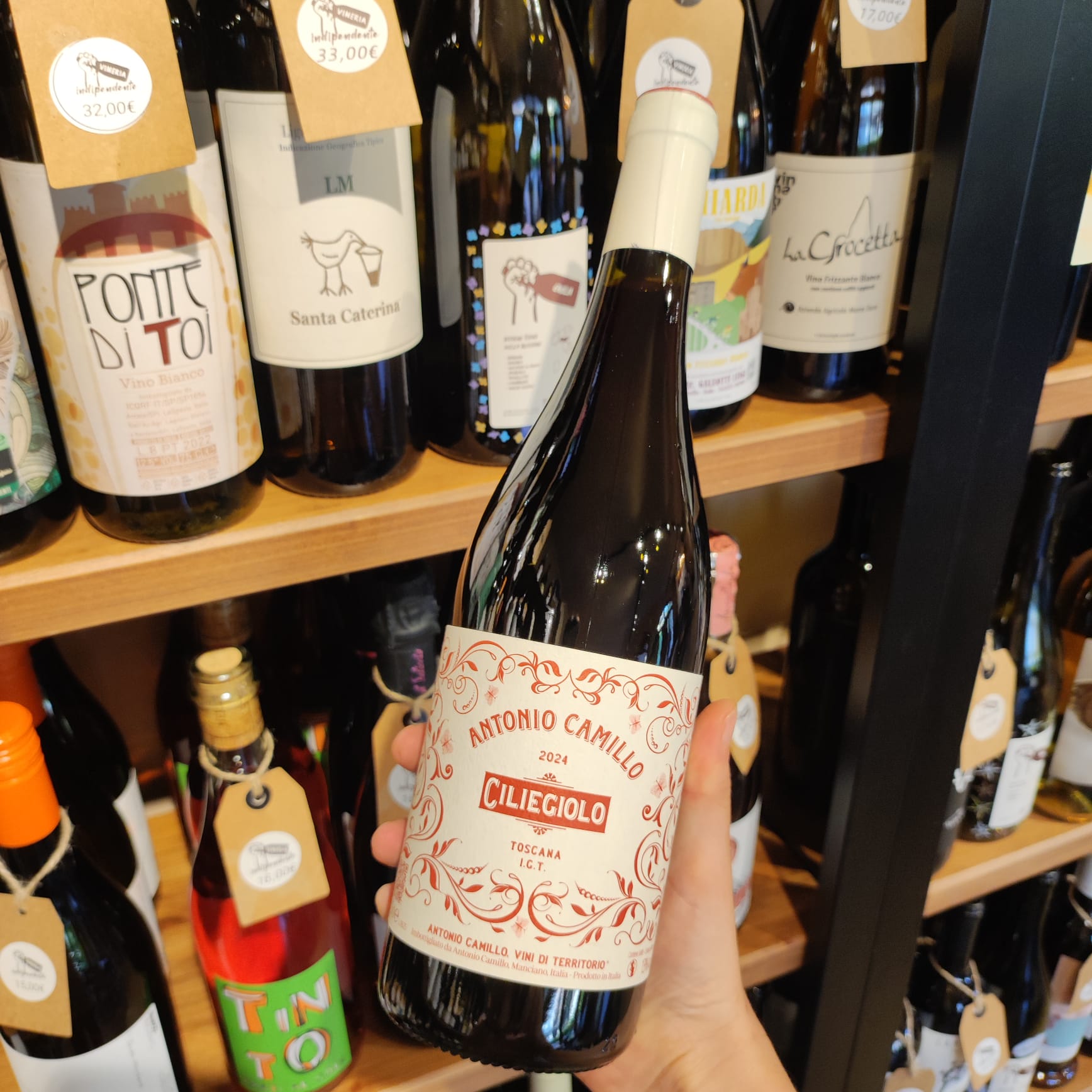 Un vino rosso che mette il vitigno al centro: 100% Ciliegiolo da vigne storiche, in piena Maremma Toscana, nei dintorni di Manciano / Capalbio. Antonio Camillo lo produce con approccio naturista, intervenendo poco, rispettando il terroir e valorizzando il carattere del vitigno che ama da sempre. Un vino dal color rosso rubino vivace, con riflessi violacei nei casi più giovani; limpido. Sprigiona profumi di frutta rossa fresca (ciliegia, marasca), note floreali (violetta e fiori piccoli), tocchi balsamici e, in versioni più complesse, sfumature minerali. Al palato è succoso, con buona freschezza; tannini presenti ma non invadenti, levigati; equilibrio fra frutto e acidità, finale persistente e piacevole.