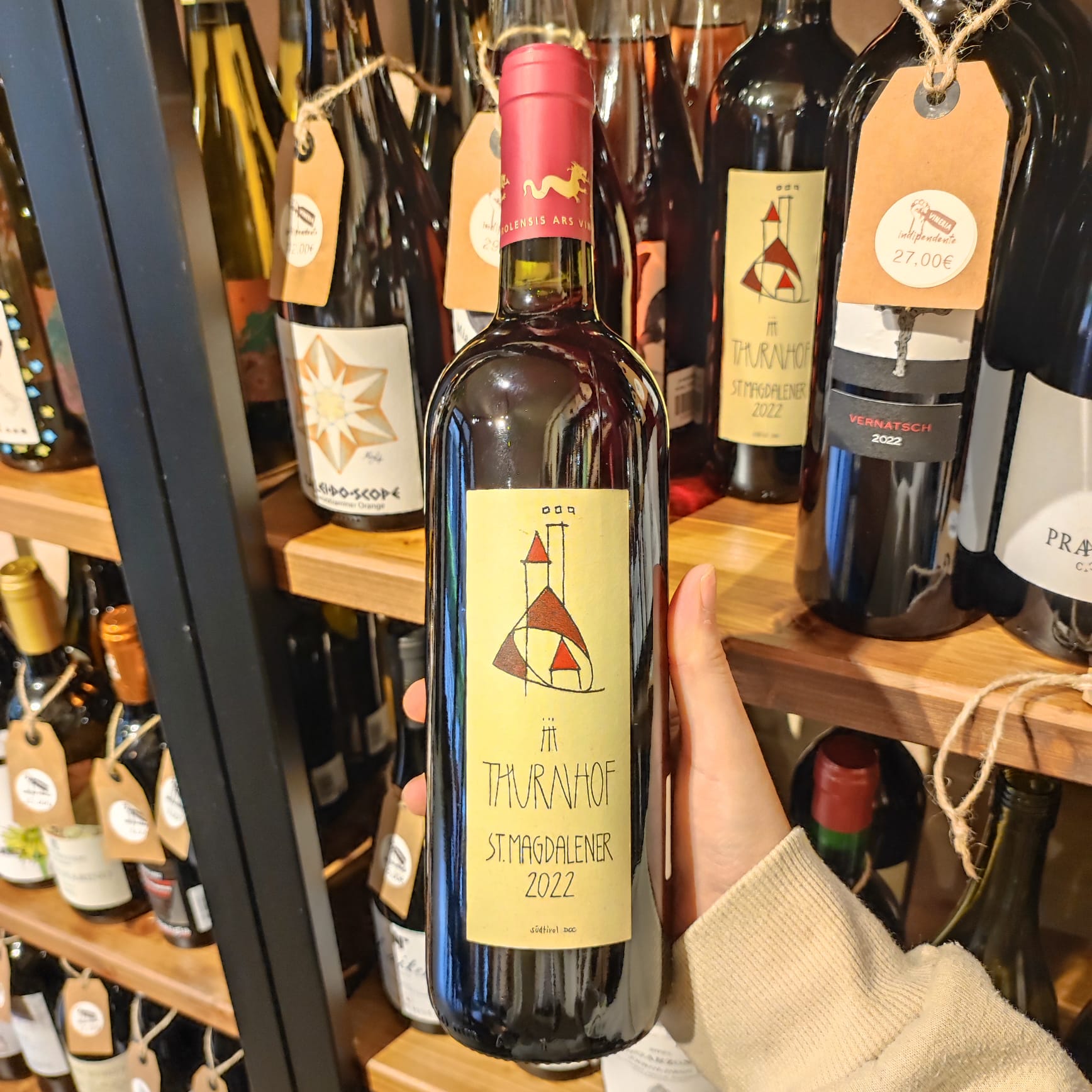 St. Magdalener di Thurnhof è un rosso elegante e leggero dell’Alto Adige, principalmente Schiava con una piccola aggiunta di Lagrein. Dal profumo di rose, ciliegie e fragole e con un delicato sentore di mandorla, offre tannini morbidi, acidità equilibrata e beva piacevole. Perfetto per accompagnare salumi, piatti leggeri o momenti conviviali.